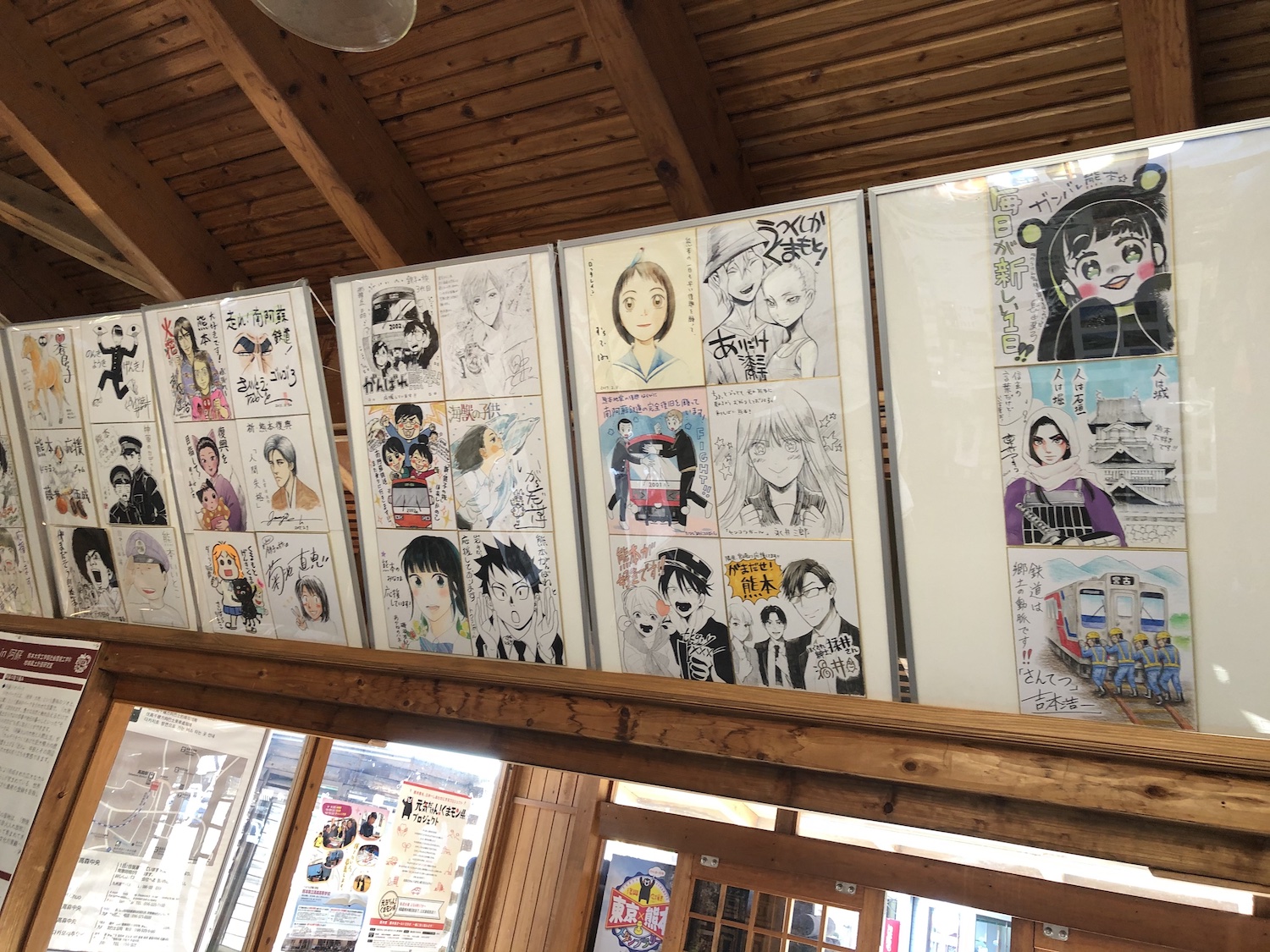 駅舎の中には、数多くの漫画家のサインが飾られています。