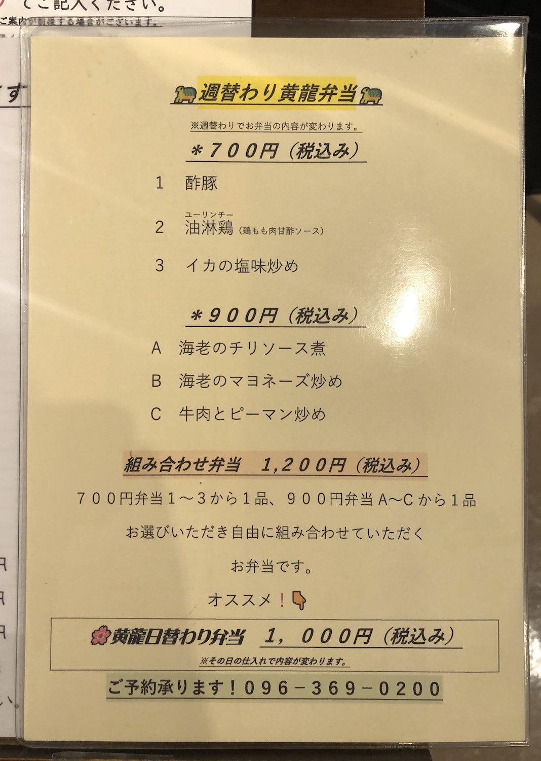 黄龍のテイクアウトメニューは、週替わりの黄龍弁当です。