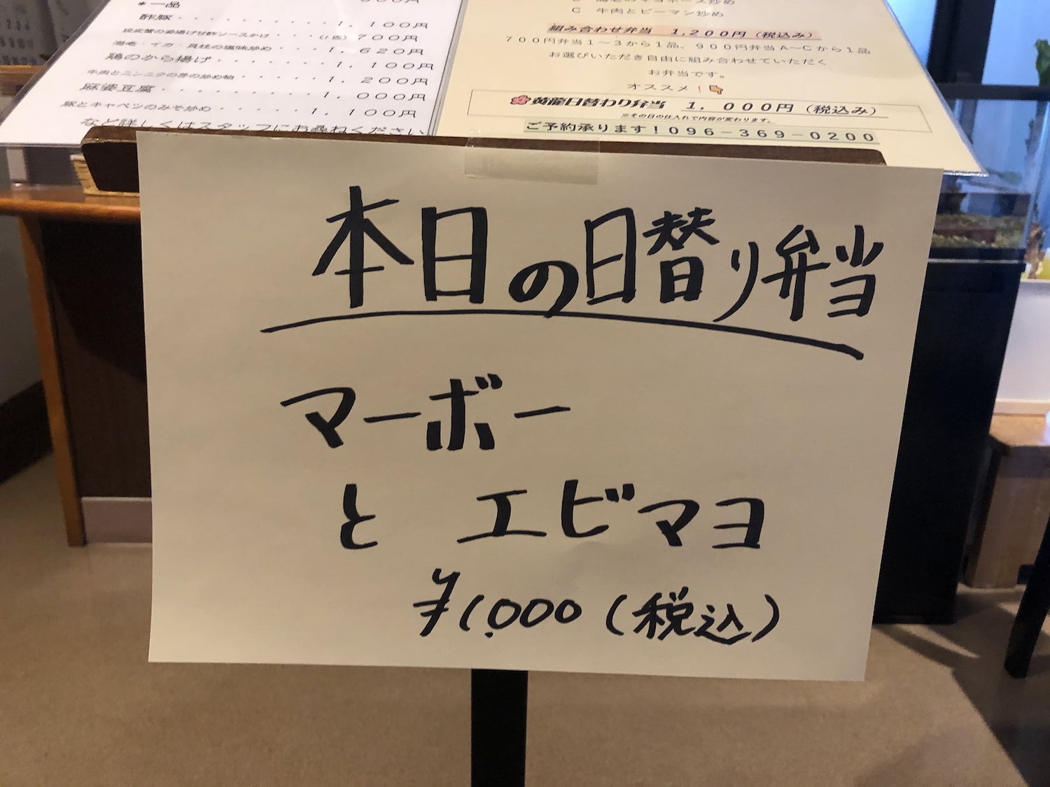 週替わりのお弁当にするか迷ったのですが、今回は、今日しか食べることができない “本日の日替わり弁当“の「マーボーとエビマヨ」を注文しました。